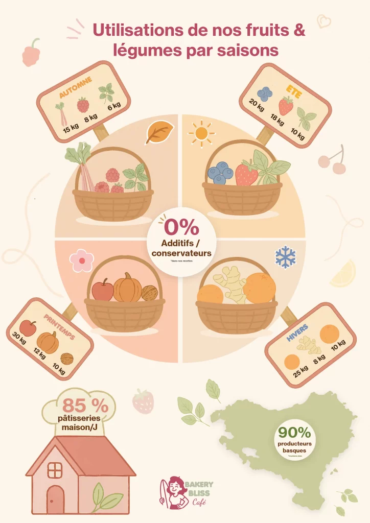 Chez Bakery Bliss Café, nous avons à cœur de proposer des produits faits maison à partir d’ingrédients frais, locaux et de qualité. Nous collaborons avec des producteurs du Pays Basque qui partagent nos valeurs : authenticité, goût, et respect des saisons.